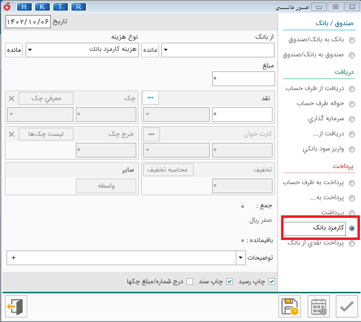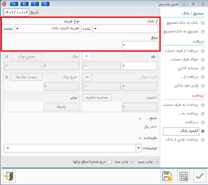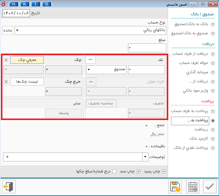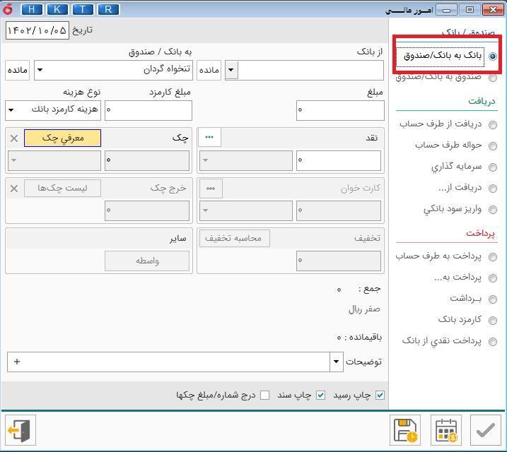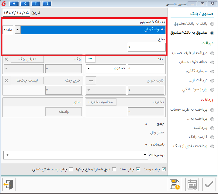 صندوق به بانک /صندوق : این گزینه برای انتقال از صندوق ها به بانک یا صندوق به کار می رود