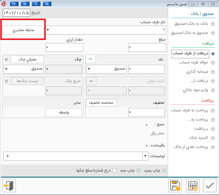 دریافت حواله زمانی به کار می رود که مشتری یا طرف حساب های شما مبلغ را مستقیم به حساب بانکی شما انتقال داده است این گزینه در دریافت / حواله طرف حساب می باشد.
