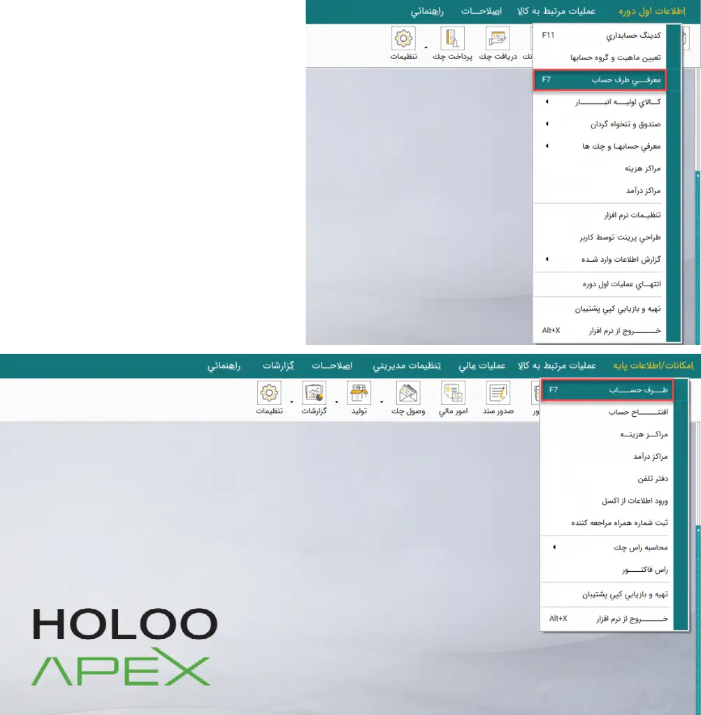 مسیر دسترسی به منوی تعریف طرف حساب در اول دوره