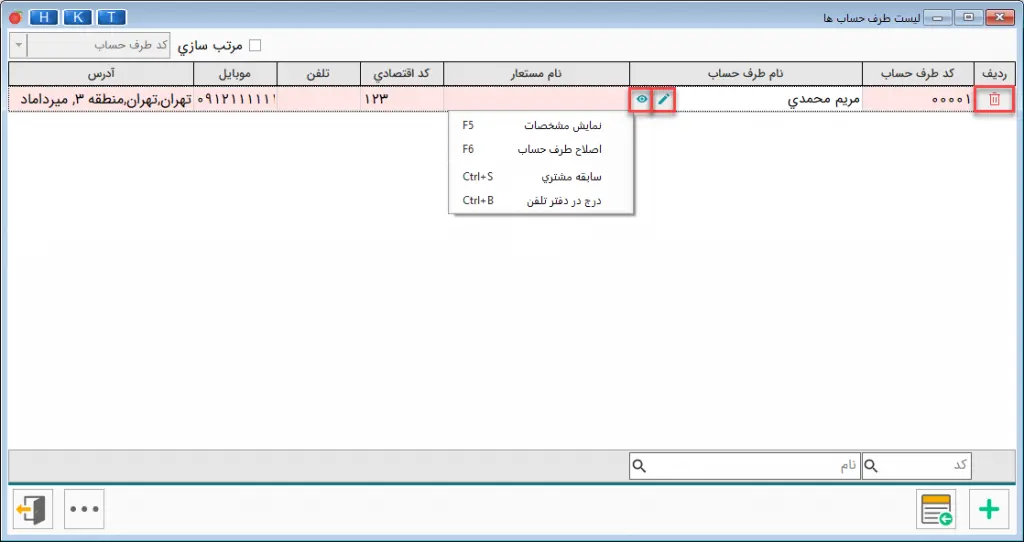 پس از ثبت اطلاعات طرف‌حساب و بازگشت به فرم لیست طرف‌حساب‌ها، با استفاده از دکمه‌های نشان داده شده می‌‌توانید اطلاعات را حذف یا اصلاح کنید و یا از امکانات بیشتر (مانند سابقه مشتری) استفاده نمایید.