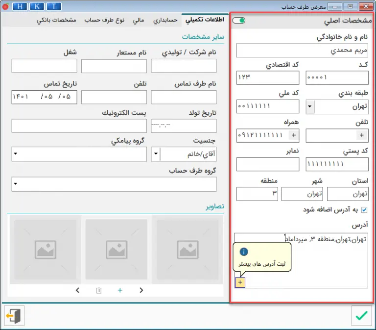 در اين قسمت، مشخصاتی مانند نام، كد اقتصادي، كد، تلفن، تلفن همراه و غيره را وارد نماييد. ورود كد الزامي نبوده ولي تعريف آن هنگام جستجوی شخص بر اساس کد، مؤثر و قابل استفاده می‌باشد، در صورت عدم تعريف كد، سيستم به صورت خودكار از كد (0001) به بعد را به ترتيب برای افراد، در نظر می‌گيرد. که پیشنهاد می شود بگذارید نرم افزار به صورت خودکار به اشخاص کد بدهد.