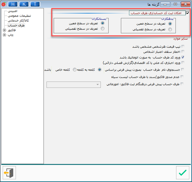 نکته: در صورتی‌که در تنظیمات نرم‌افزار، گزینه “امكان ثبت كد حسابداري طرف حساب” را فعال کرده باشید، می‌توانید بدهکار یا بستانکار بودن طرف‌حساب را تعیین نمایید.